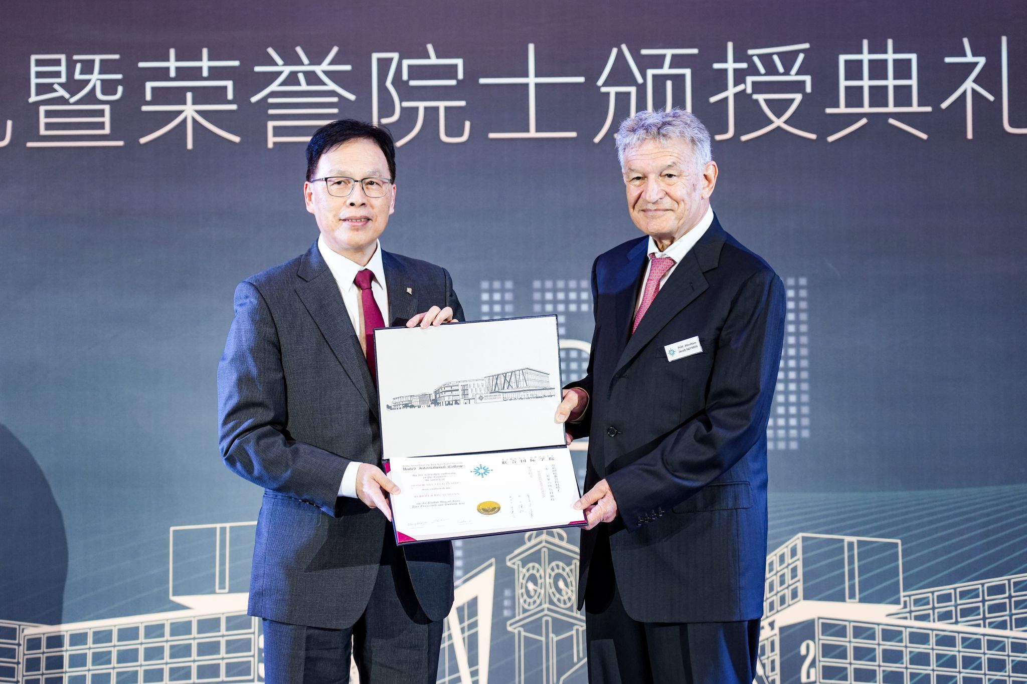 Representing Prof Aumann at the ceremony was Prof Abraham Jacob Neyman, Chair of the Academic Committee of Federmann Center, Former Chairman of the Institute of Mathematics of Hebrew University of Jerusalem, and Member of Academia Europaea. He is also a student of Prof Aumann. Meanwhile, Prof Andy Liu Luchuan from BNBU’s Faculty of Business and Management completed a doctorate under the supervision of Prof Neyman. This meaningful gathering of three academic generations at BNBU marked a special moment, and Prof Aumann extended his heartfelt wishes for Prof Liu in further advancing the study of game theory.