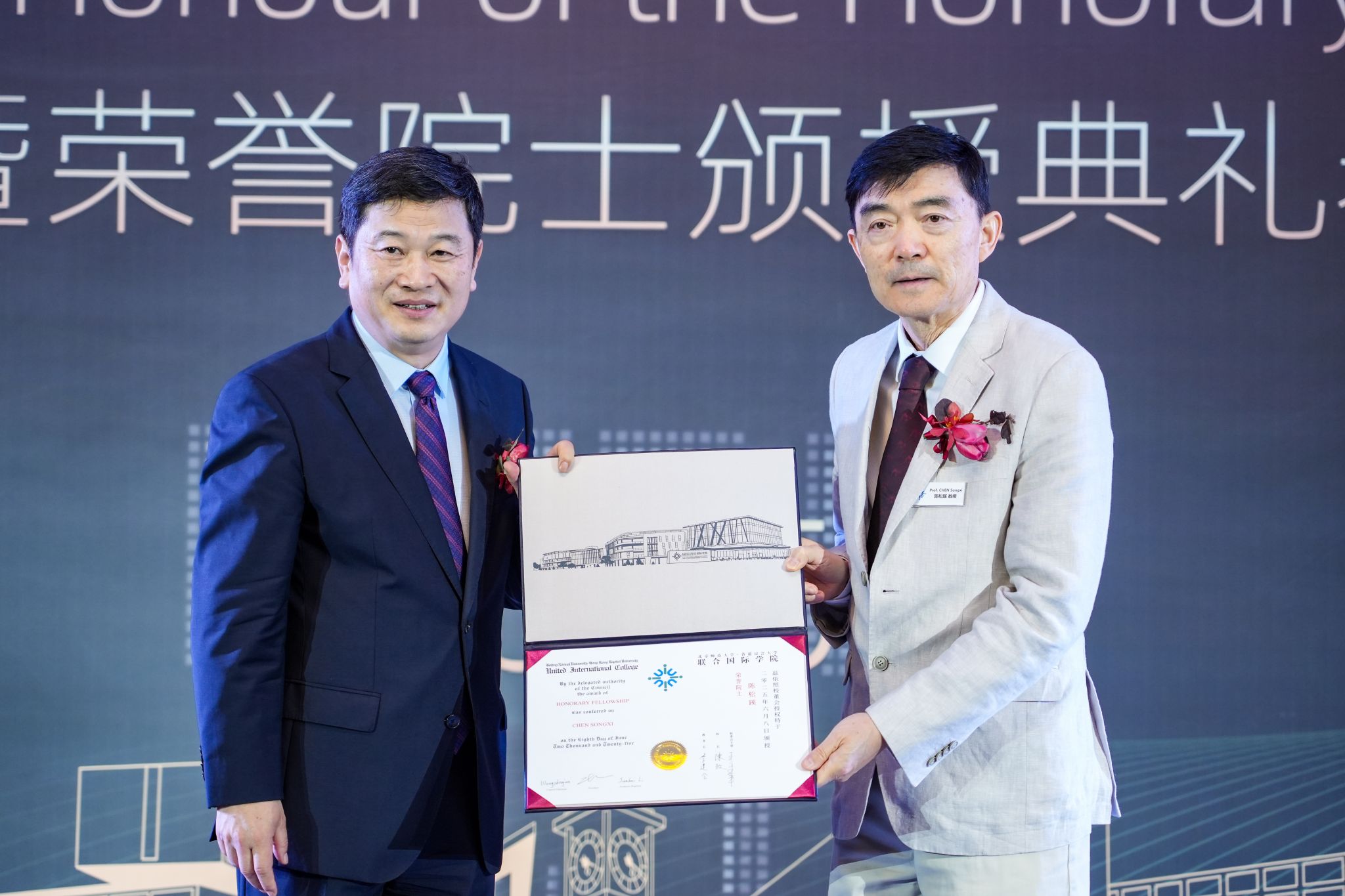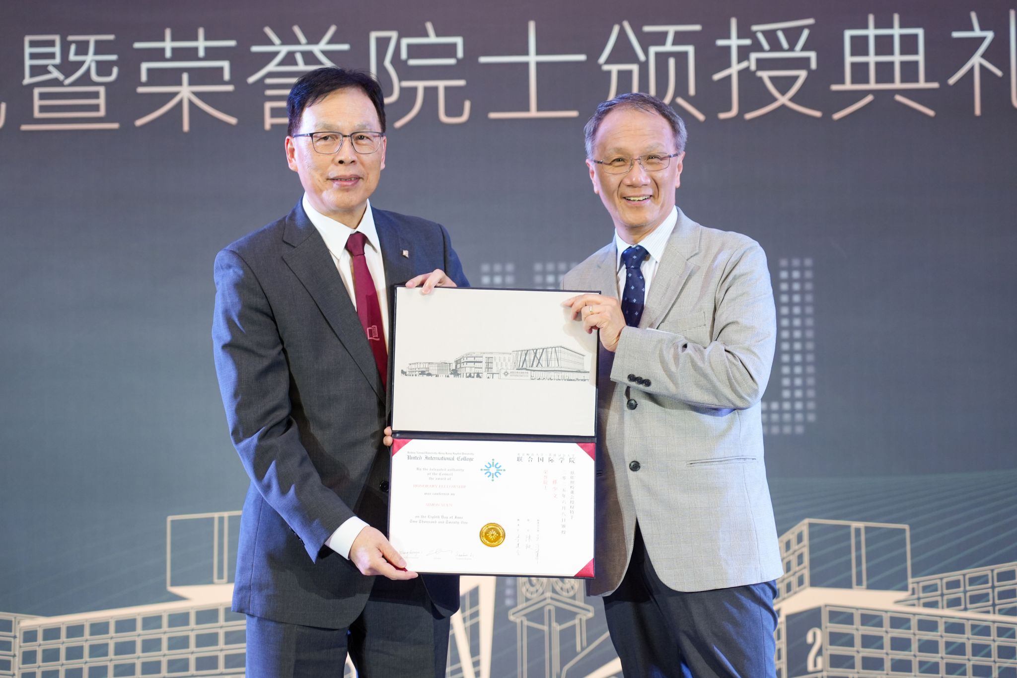 A conferment banquet was held later, where HKBU Senior Presidential Advisor Prof Ricky Wong, BNBU President Prof Chen Zhi and BNBU Provost Prof Patrick Chau presented the certificates to the Fellows.