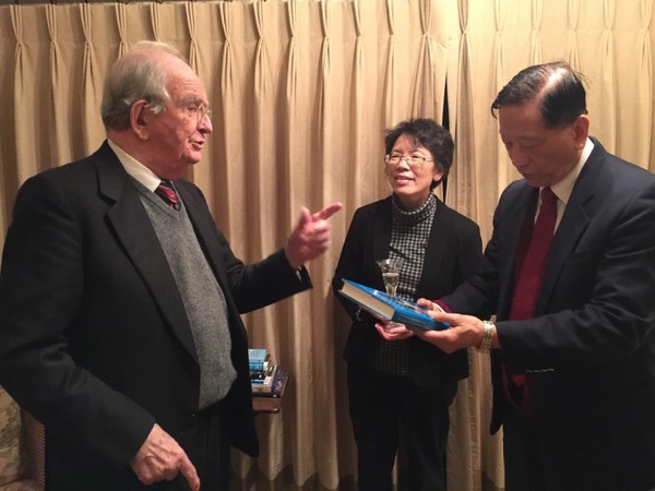 The delegation then visited Prof Sir John Meurig Thomas at the University of Cambridge to present his UIC honorary fellowship certificate and regalia. Prof Thomas, who was not able to travel to Zhuhai in June for the conferment ceremony, expressed his heartfelt thanks.