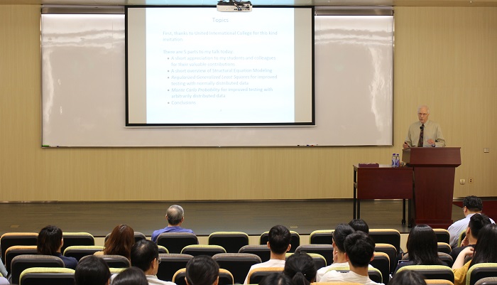 On 28 June, UIC’s Applied Psychology programme (APSY) and Statistics (STAT) programme invited Prof Peter M. Bentler to come to UIC and organized a talk for him to give that was titled, “Regularized GLS and Monte Carlo Probability for Improved Structural Equation Model Evaluation”. Prof Bentler is an American psychologist, statistician, and distinguished professor at the University of California, Los Angeles. He received the award of UIC Honorary Fellowship on 29 June.